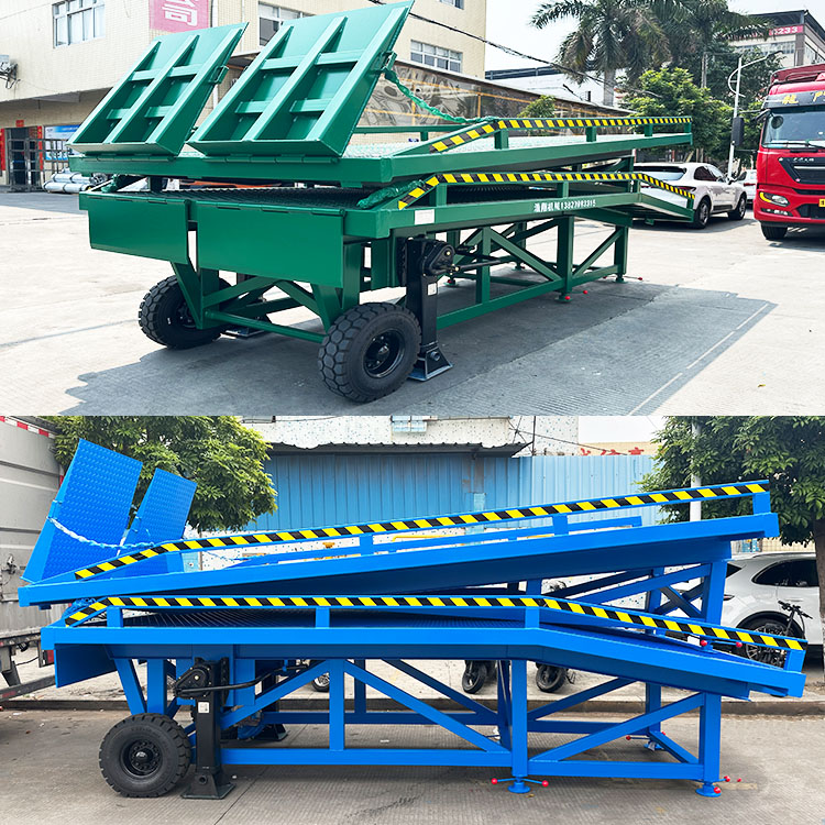 移动式登车桥移动式登车桥一般用于现场无装卸货平台或需要流动装卸货物的场所。如果物流现场没有装卸货平台,作为补救措施,移动式登车桥是非常适用的方案之一,移动式登车桥相当于一个移动的钢结斜坡,叉车同样能直接驶入卡车车厢内部进行批量装卸作业。只需单人操作,不需动力电源,即可实现货物的装卸。